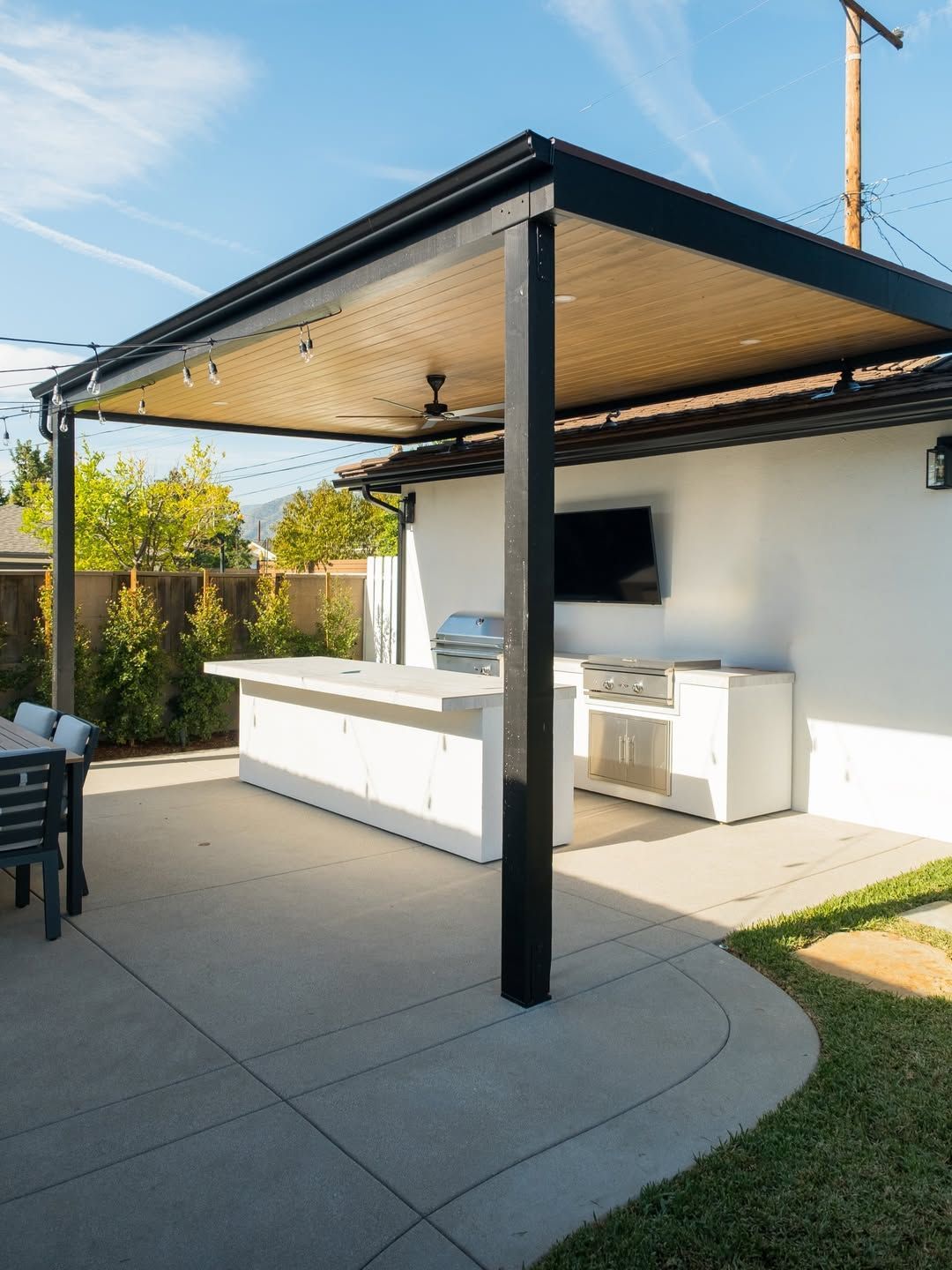 We transformed this backyard in Upland, CA 91786 with a custom patio cover and premium outdoor kitchen designed for comfort, style, and year-round enjoyment. The project included a groovin’ tongue and groove ceiling, recessed lighting, and an outdoor fan for a cool, inviting space, plus a sleek outdoor kitchen built by Outdoor Elegance. The result is a fully functional outdoor living area that combines durable construction, thoughtful lighting, and entertaining-ready features for homeowners who love hosting.